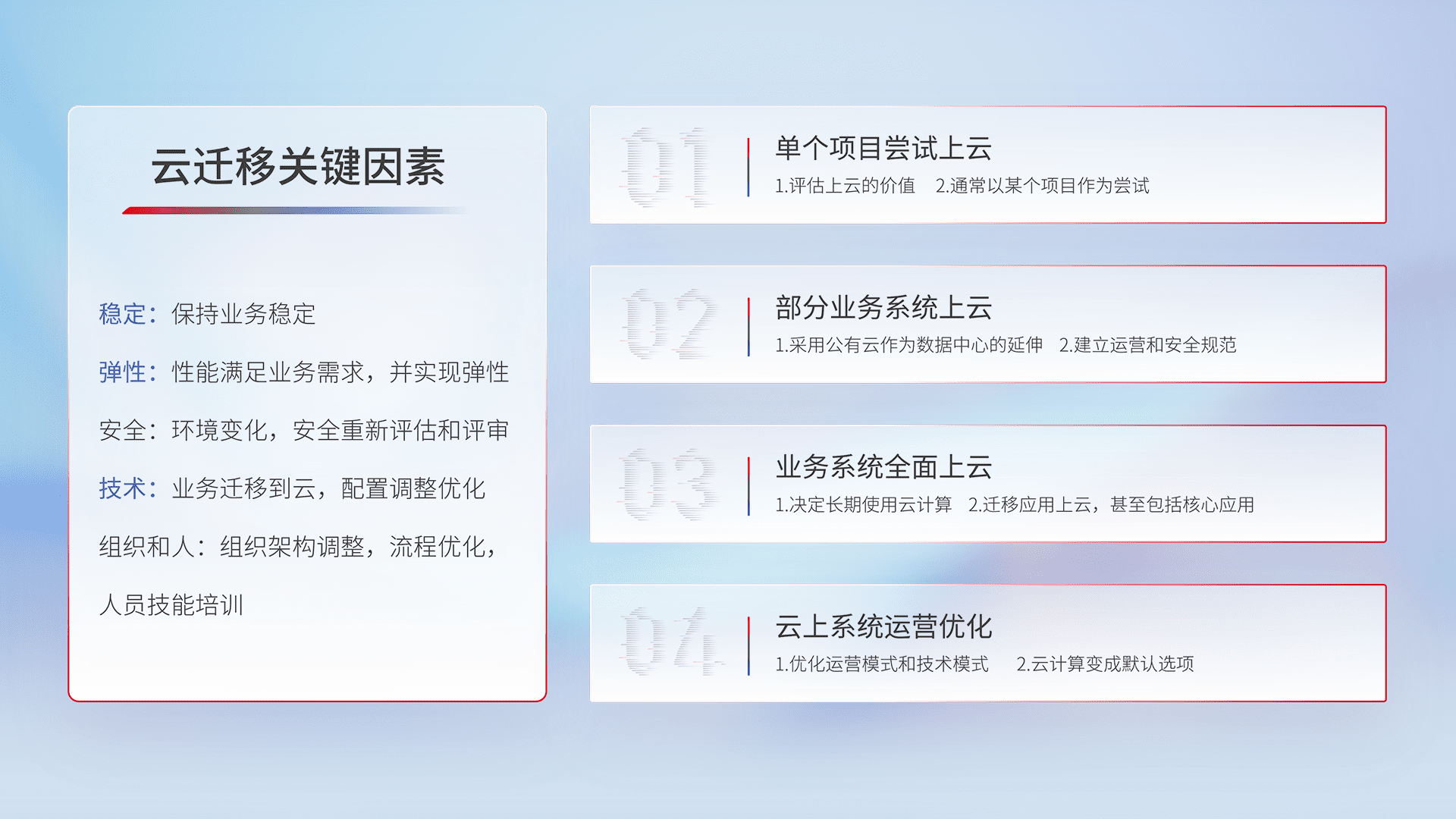 结合实际业务,,从规划设计、、云平台选型、、、、云原生改造、、、、数据迁移、、集成交付,,,迁移全过程为客户识别最佳上云路径,,,做好风险识别管理,,,设计网络架构、、身份权限、、、安全审计合规、、、操作审计、、日志审计、、监控告警策略、、多站点容灾设计等,,对云上基础设施进行整体规划,,,提升IT治理水平,,,,以满足弹性、、、高可用、、、高性能的需求。。。