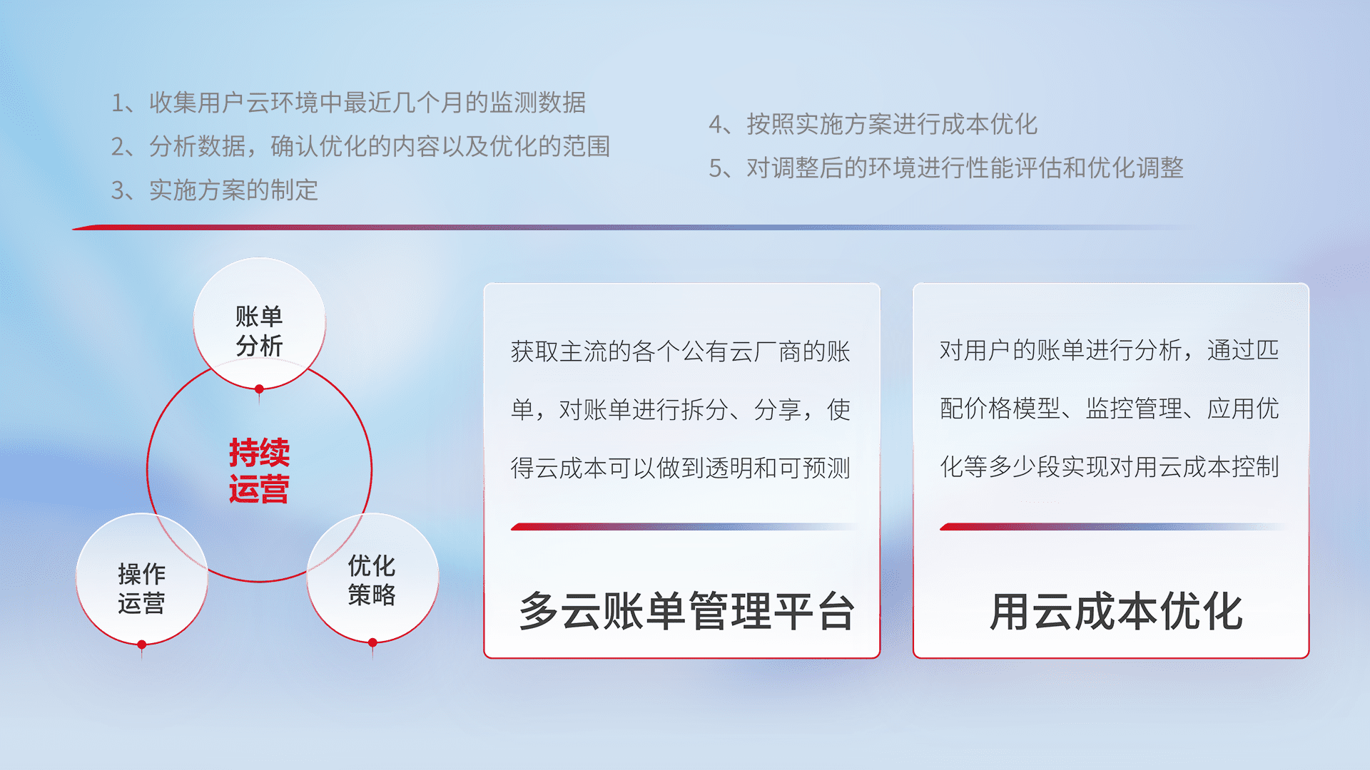 通过多云纳管,,,,以统一的资源数据模型把客户的云资源进行抽象和封装,,,进而实现对多云资源的统一操作,,保障云资源管理的可靠性、、、、稳定性与可用性。。量身定制化运维内容,,,,配置、、开发运维、、、补丁管理、、备份、、、、监控、、、、认证和访问管理、、、、审计和日常巡检等,,,,保障在用云过程中的可靠度,,,,稳定度以及高可用率。。。
