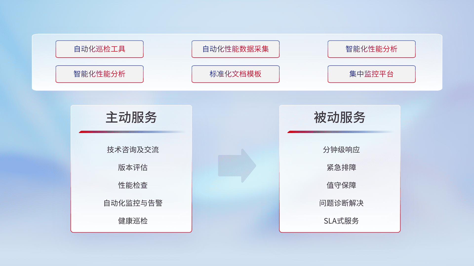 智能化工具和标准化文档,,,,保障服务质量,,,,提供主动服务(包含技术咨询、、、、版本评估、、性能检查、、、自动化监控与告警、、健康巡检)和被动服务包含(分钟级响应、、、、紧急排障、、、值守保障、、、问题诊断解决、、SLA服务)。。。